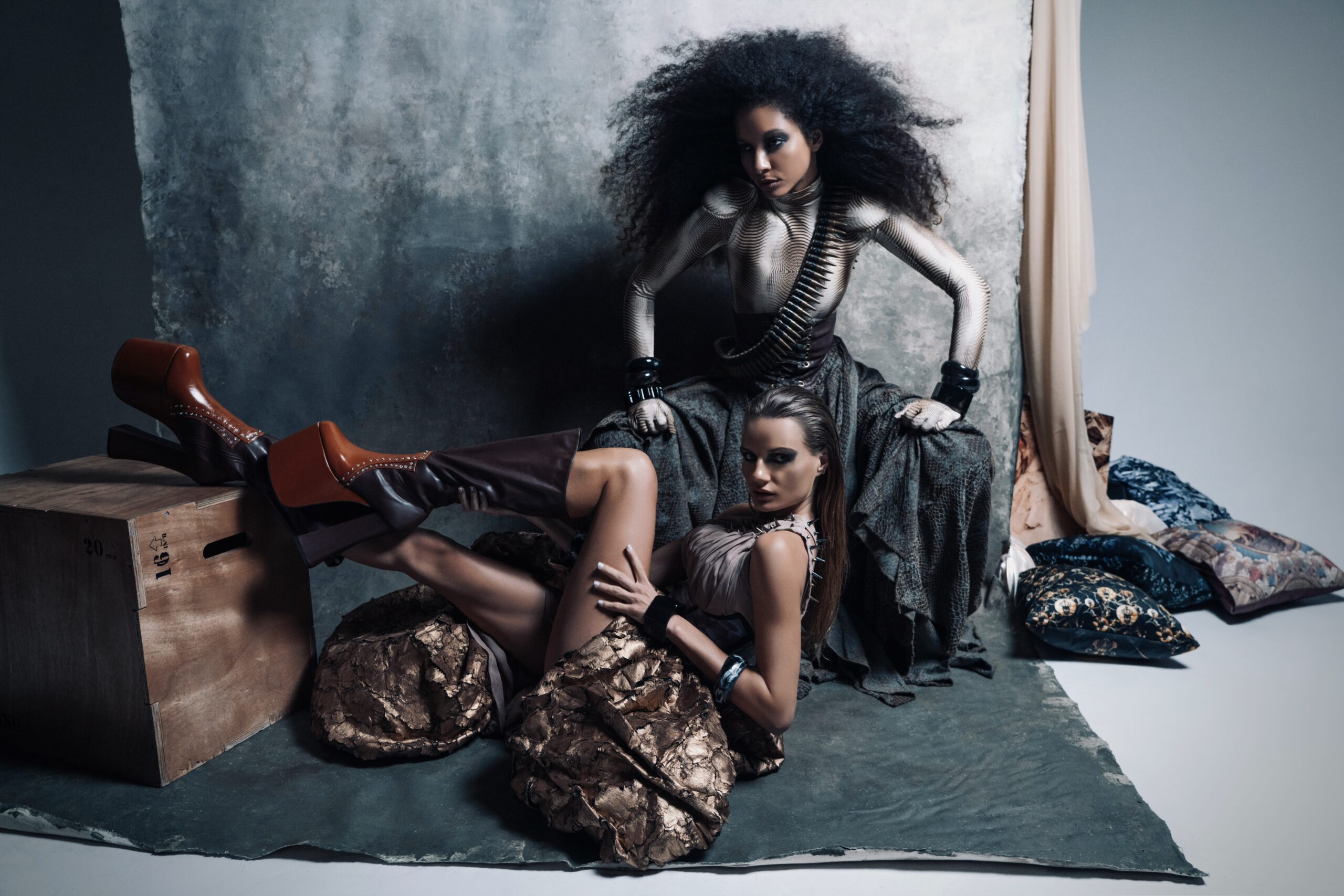 Las siluetas escultóricas evocan tanto artefactos arqueológicos como futuros posibles. Los volúmenes, las texturas metálicas, la corsetería arquitectónica y los ornamentos rituales funcionan como objetos artísticos, más cercanos a la escultura contemporánea que a la moda convencional. Cada pieza se convierte en un fragmento de un mito visual que las modelos encarnan con presencia casi ritual.